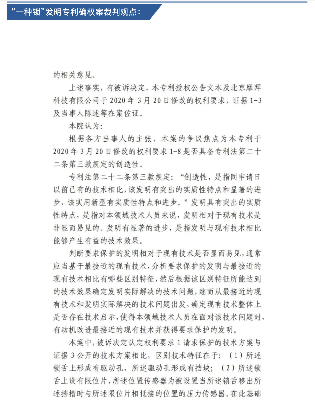 近日,北京知識產權法院發(fā)布了《專利確權授權審判案析2014-2024》,從其十年間審結的逾一萬件專利確權授權案件中,精選了58件具有指導意義的案例,并提煉出20條案析規(guī)則,為業(yè)界提供明確的司法指引。三聚陽光代理的“一種鎖”發(fā)明專利確權案因其典型性入選,為專利創(chuàng)造性的判斷提供了有力示范。