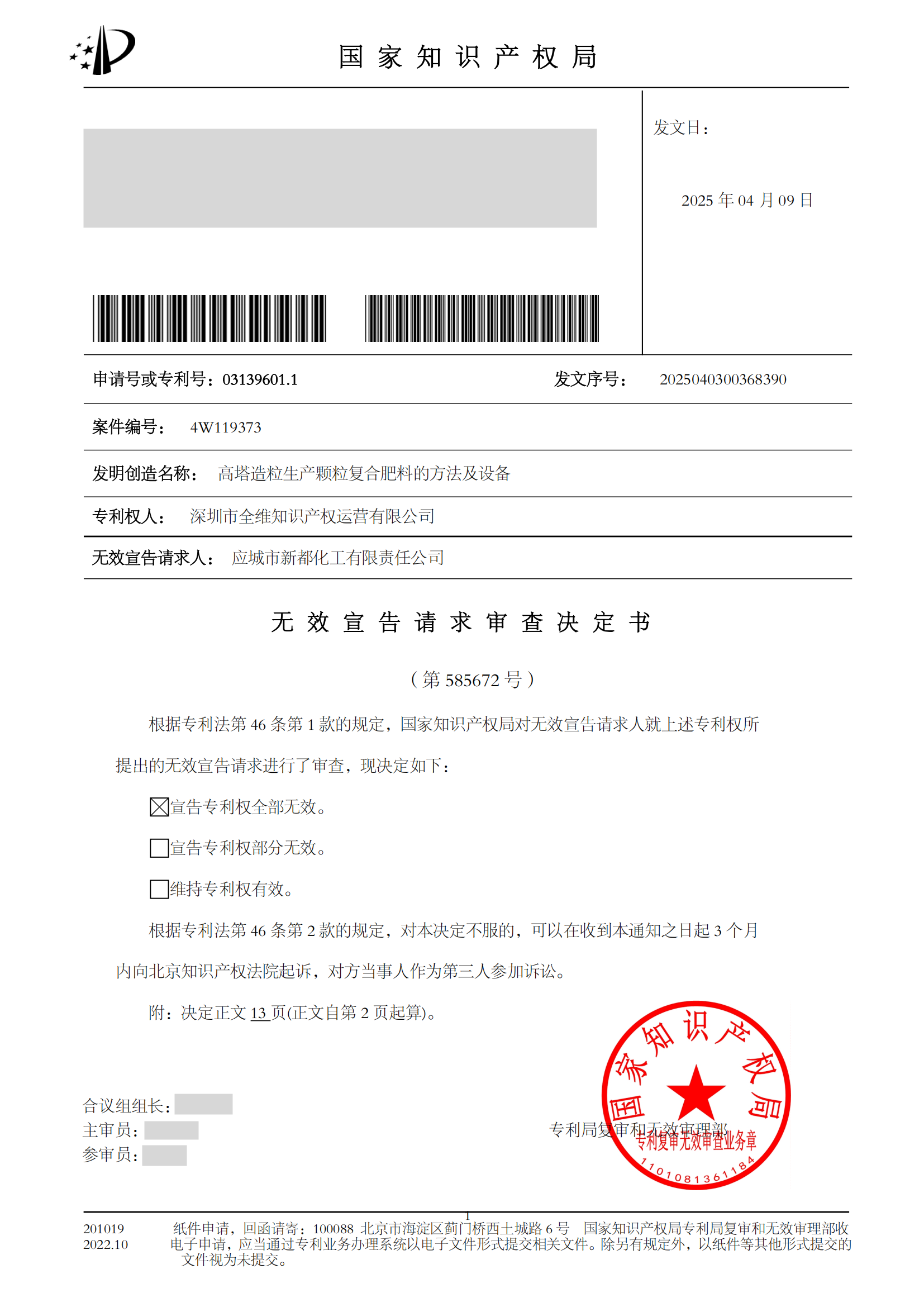 據(jù)此,國(guó)家知識(shí)產(chǎn)權(quán)局于2025年4月9日正式發(fā)出第585672號(hào)無(wú)效宣告請(qǐng)求審查決定書(shū),宣告專(zhuān)利號(hào)為 03139601.1 的“高塔造粒生產(chǎn)顆粒復(fù)合肥料的方法及設(shè)備”發(fā)明專(zhuān)利權(quán)全部無(wú)效。