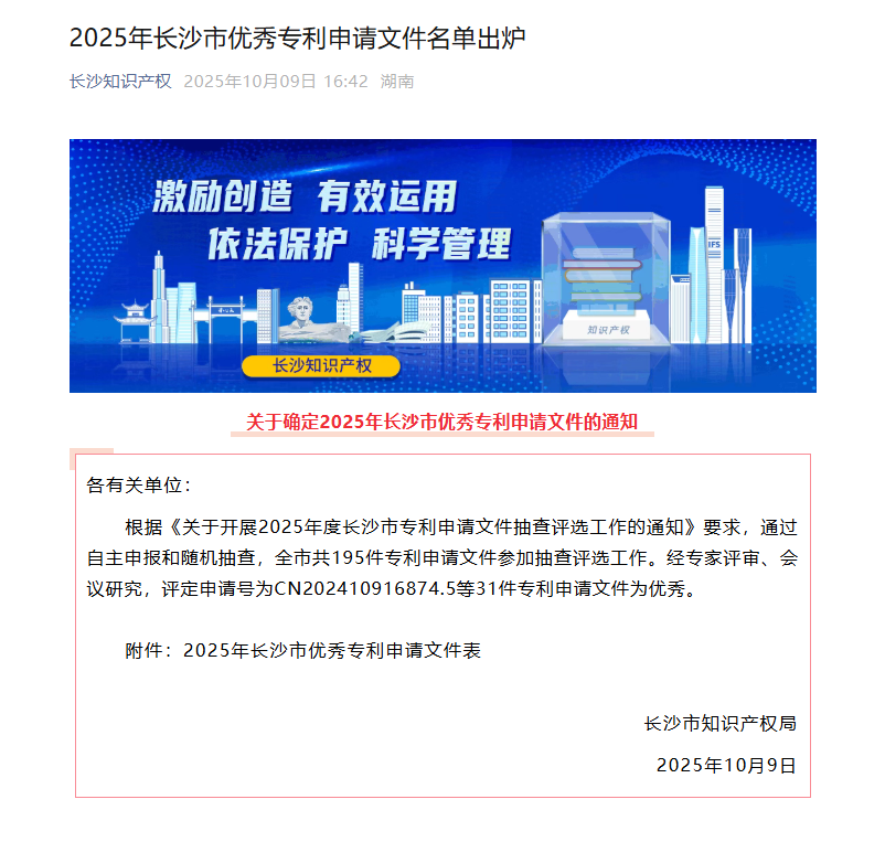 10月9日,長沙市知識產(chǎn)權(quán)局公布“2025年度長沙市優(yōu)秀專利申請文件名單”,北京三聚陽光知識產(chǎn)權(quán)代理有限公司撰寫的2件發(fā)明專利申請文件成功入選,彰顯了公司在高質(zhì)量專利撰寫領(lǐng)域的出色實力和穩(wěn)定發(fā)揮。